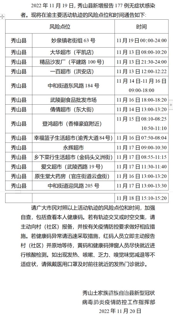 关于新增报告177例无症状感染者在渝活动轨迹的风险点位和时间的通告