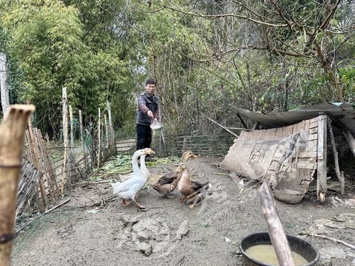1月5日,没有去工业园区上班的张先武在家里喂鸡喂鸭。记者 颜安 摄