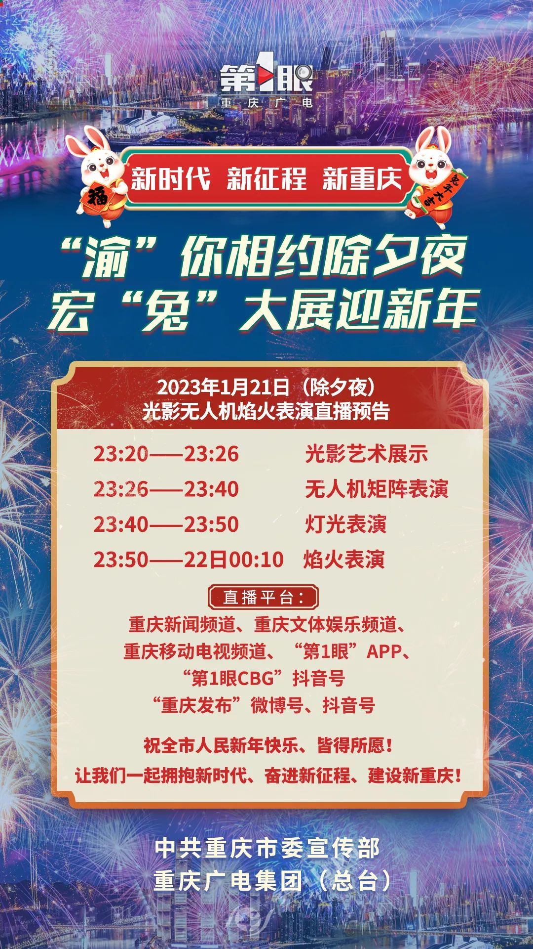 1月21日,重庆市委宣传部将组织重庆广电集团等市属媒体推出“新时代新征程新重庆”除夕活动视频直播,用多彩的光影、无人机矩阵、绚烂焰火展现巴山渝水谱新篇的盛景。