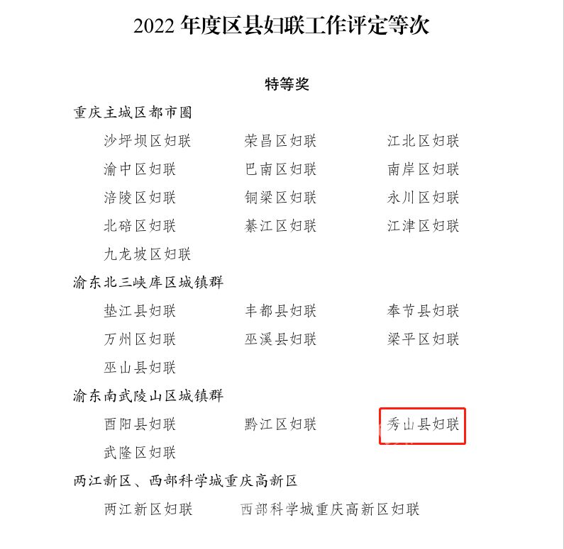 秀山网讯 近日,重庆市妇联发布通知,对各区县妇联2022 年度工作进行表扬,秀山县妇联获得重庆市妇联系统特等奖。