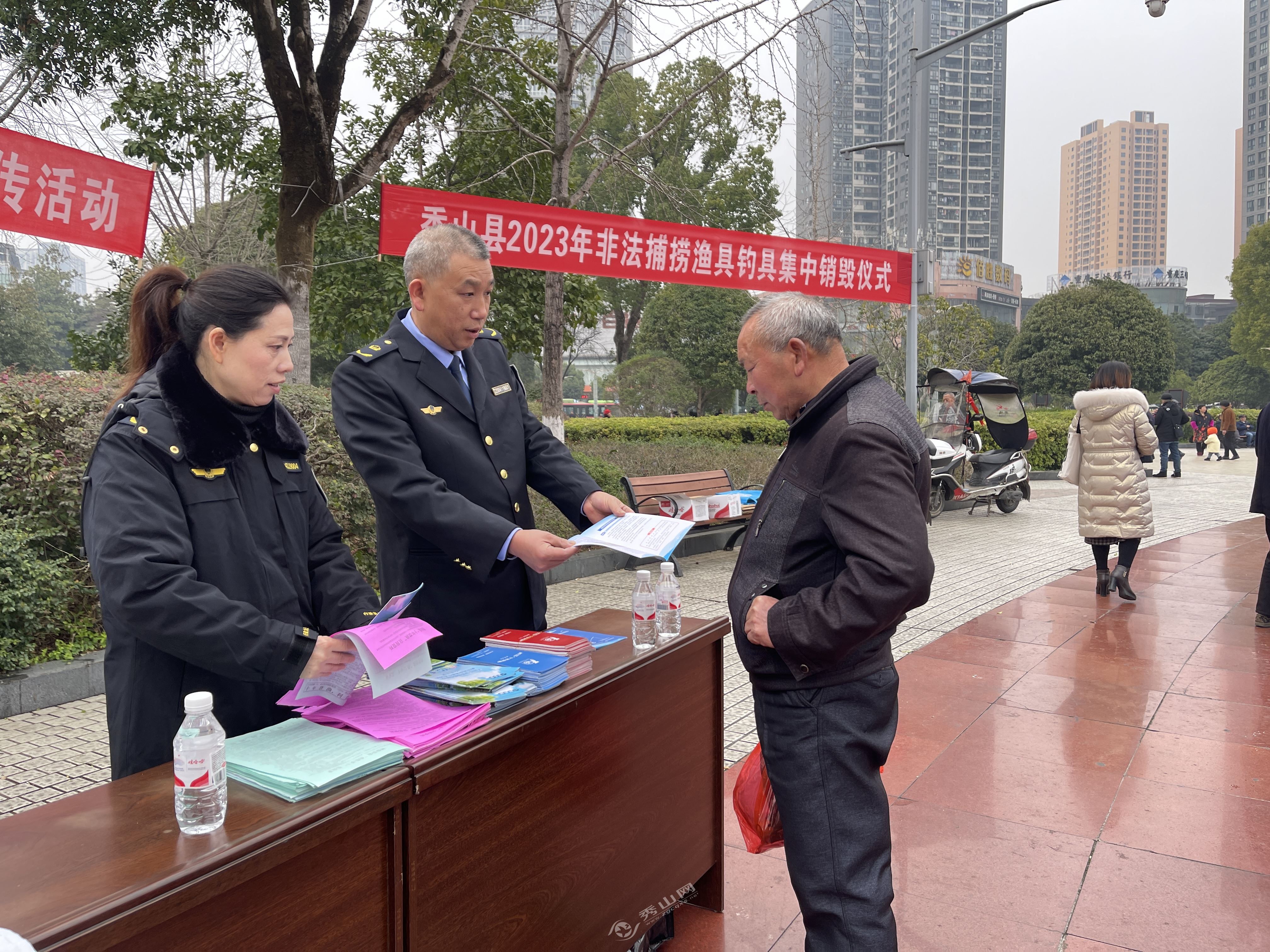 秀山网讯 为彰显打击非法捕捞行为的坚强决心,营造“不敢捕、不能捕、不想捕”的浓厚社会氛围,震慑心存侥幸的违法人员。2月28日上午,秀山长江禁捕退捕工作领导小组办公室,在花灯广场开展2023年长江“十年禁渔”宣传活动,并举办集中销毁渔具钓具等非法捕捞涉案渔具集中销毁仪式。
