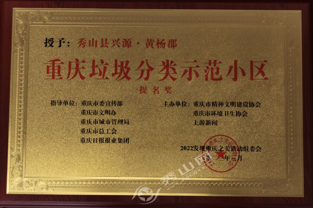秀山网讯 近日,2022“发现重庆之美”评选结果揭晓。秀山兴源·黄杨郡小区荣获“重庆垃圾分类示范小区提名奖”。