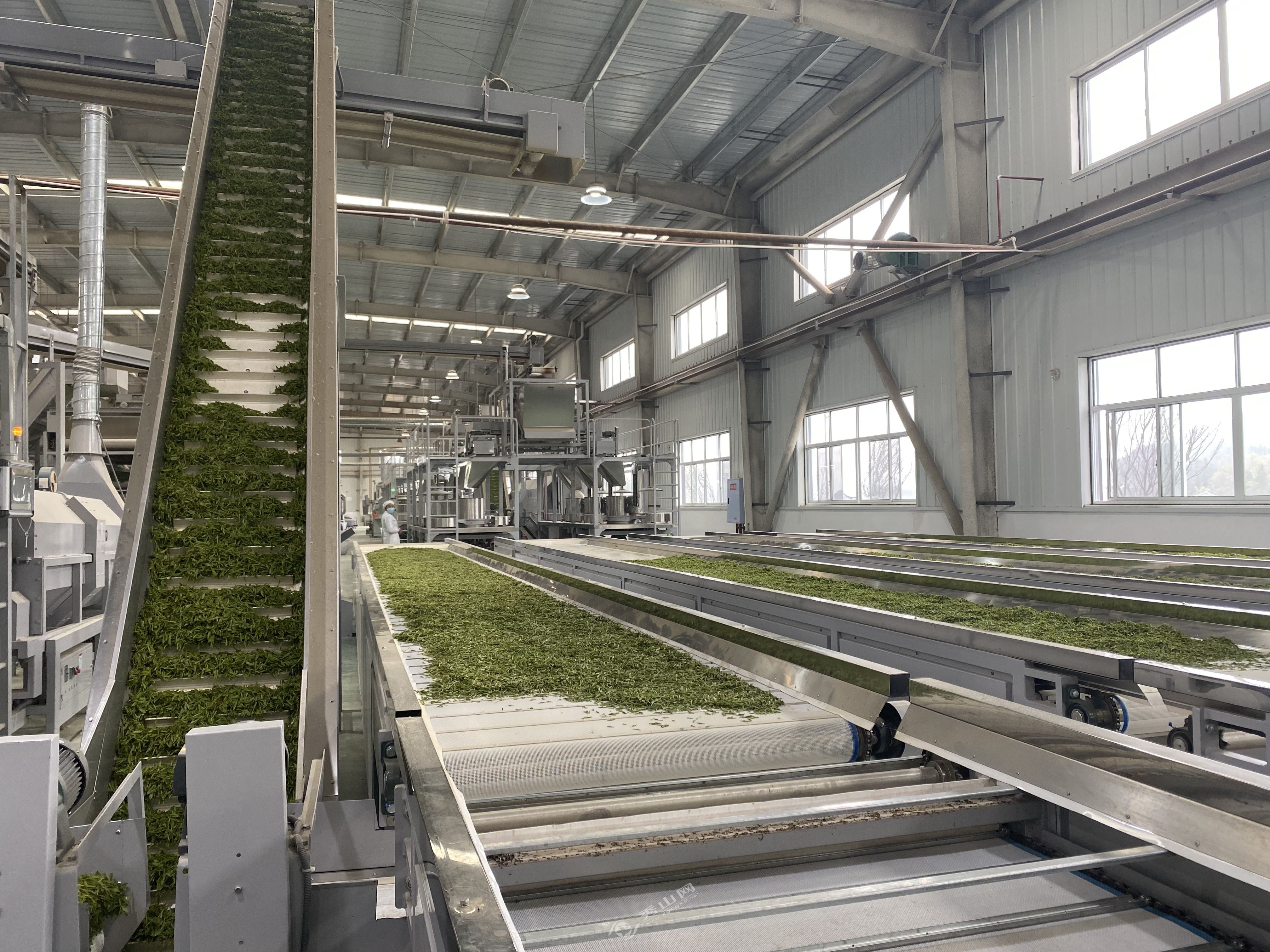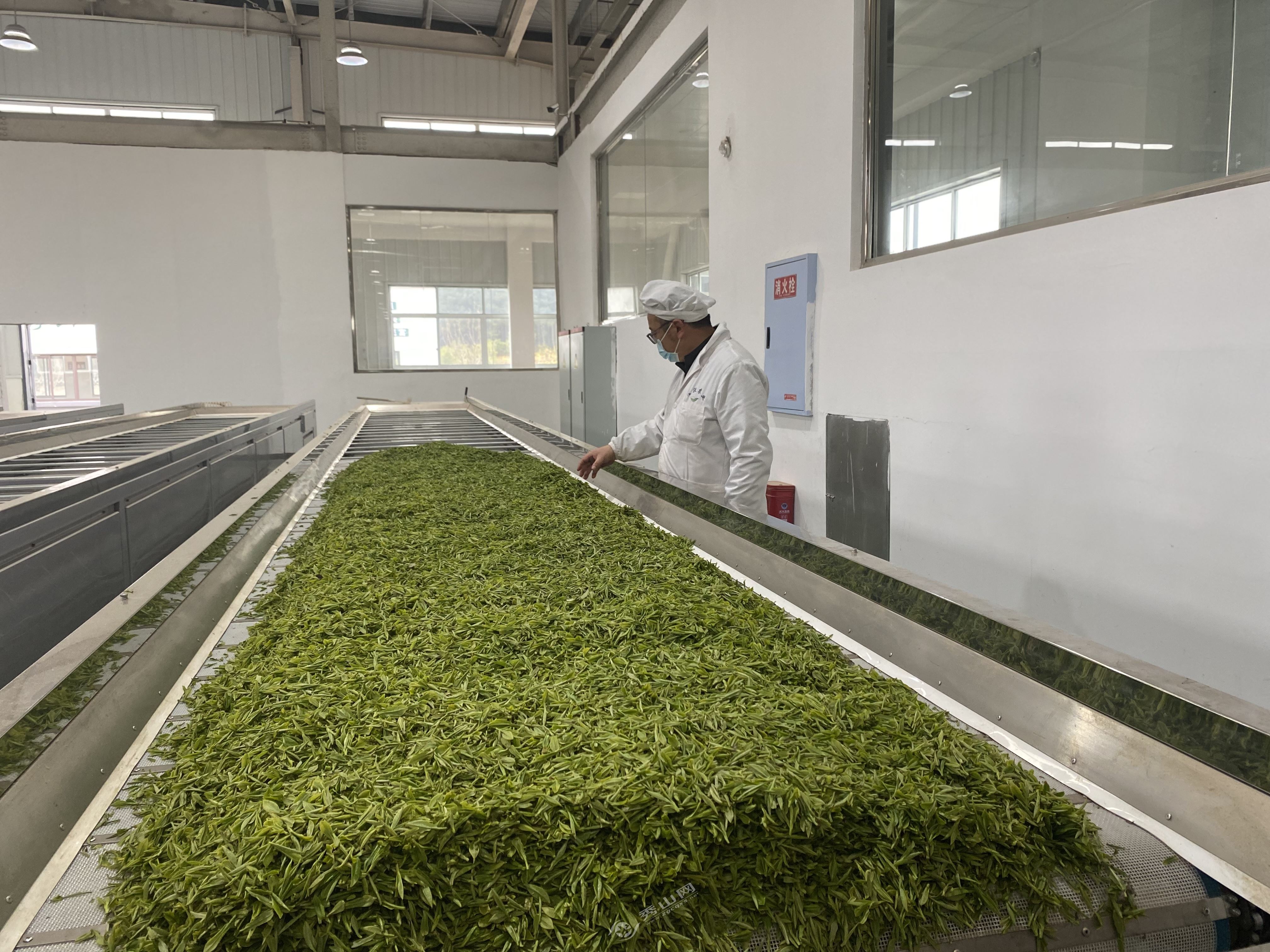 山下的茶叶加工车间里,机器轰鸣,制茶机不停运转,工人们有条不紊地进行茶青摊凉、杀青、揉捻、翻炒等工序,车间内茶香扑鼻。