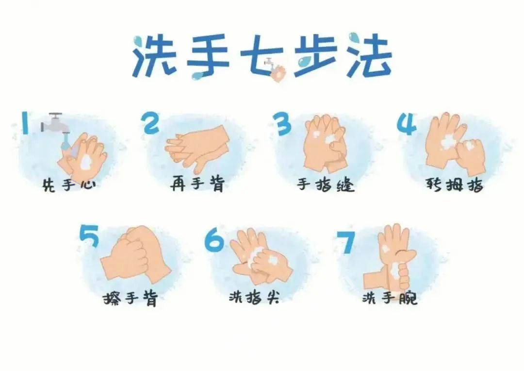 (二)勤于洗手广泛宣传“七步洗手法”,在节约用水的前提下勤洗手;倡导公众在咳嗽或打喷嚏后、照顾病人时、制备食品前后、饭前便后、处理动物或动物排泄物后、外出回家时用洗手液(肥皂)和流动水洗手。