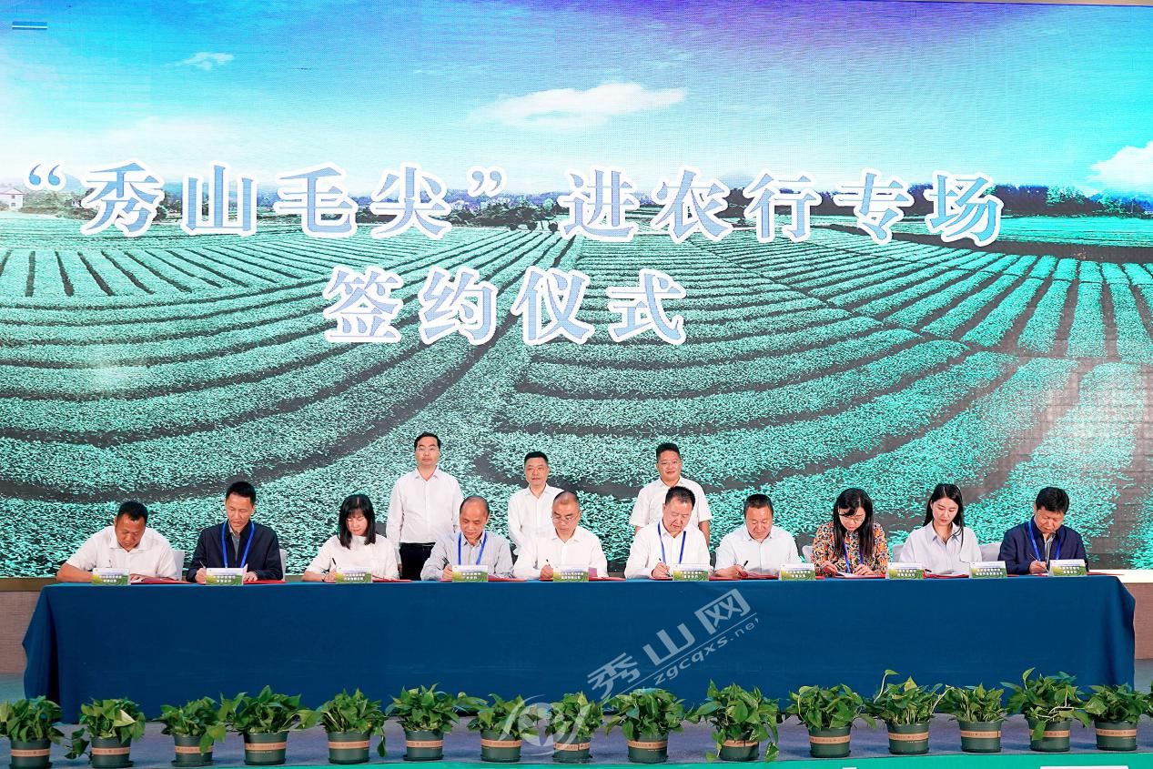 秀山网讯 2023年4月20日,重庆秀山,首届“秀山毛尖”杯茶王赛暨第二届武陵山茶文化节隆重开幕,在全体参会人员的瞩目下,成功举行了“秀山毛尖”上线农行兴农商城启动仪式和“秀山毛尖”进农行专场签约活动,成为定点帮扶助力秀山县产业发展的新见证。