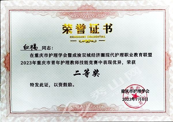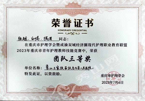 秀山网讯 日前,在2023年重庆市青年护理教师临床技能竞赛中,秀山县人民医院选派感染科白杨、呼吸与危重症医学科杨眉、重症医学科张越组成的秀山代表队荣获团体三等奖,是渝东南片区唯一获奖单位,也是参赛为数不多的二级甲等综合医院。此外,白杨获个人二等奖。