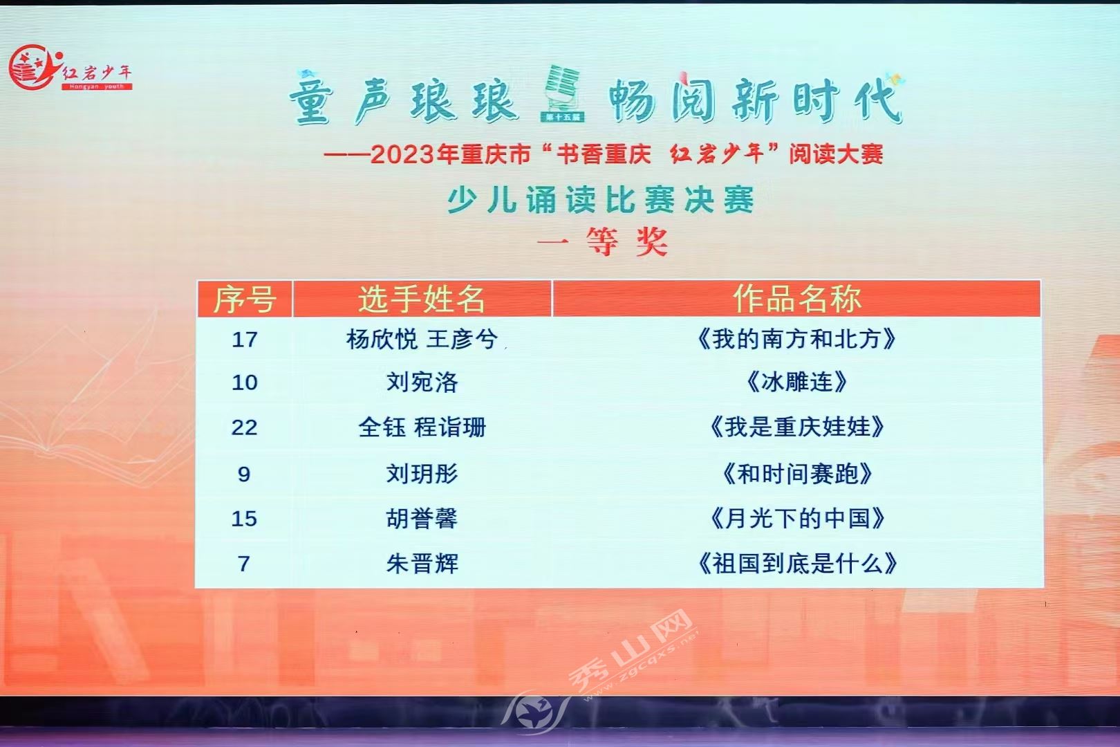 秀山网讯 7月12日,由市委宣传部、市文化旅游委、市教委、团市委、市妇联主办的2023年重庆市“书香重庆 红岩少年”阅读大赛少儿诵读比赛决赛在渝北举办。来自全市各区县的32个作品、42名选手同台竞技、各展风采。其中,由我县图书馆推送的选手刘宛洛诵读作品《冰雕连》以排位第二的成绩荣获一等奖。