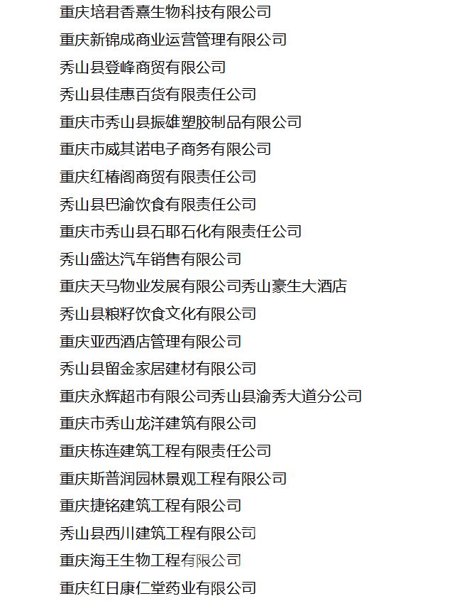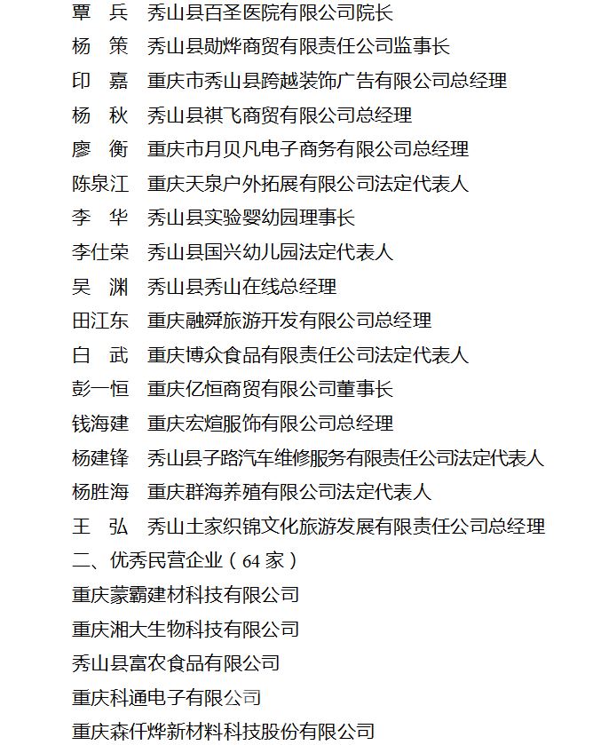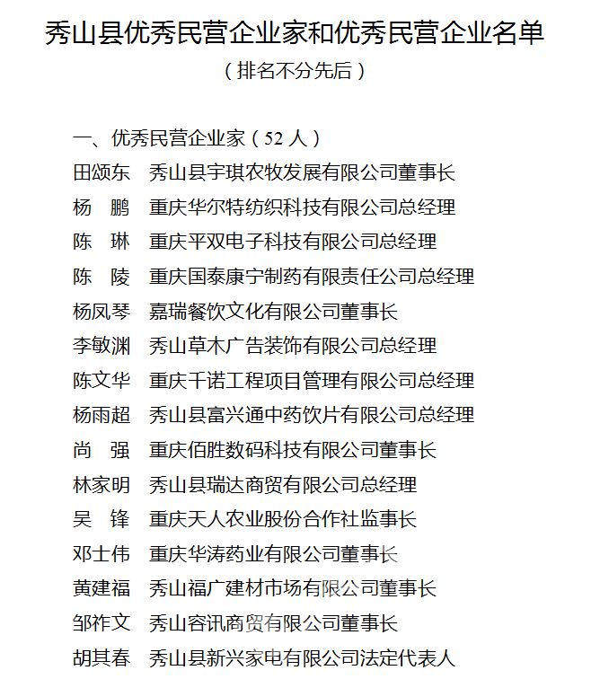 《通报》指出,近年来,全县广大民营企业家和民营企业坚持以习近平新时代中国特色社会主义思想为指导,奋发有为、艰苦创业、敢于创新,成为秀山经济发展的重要支撑、创新创业的主体力量、吸纳就业的主要渠道和社会财富的重要来源,为秀山经济社会持续健康发展作出了重要贡献,涌现出一大批先进典型。为表扬先进、树立典型,县委、县政府决定,授予田颂东等52人“秀山县优秀民营企业家”、重庆蒙霸建材科技有限公司等64家民营企业“秀山县优秀民营企业”称号。
