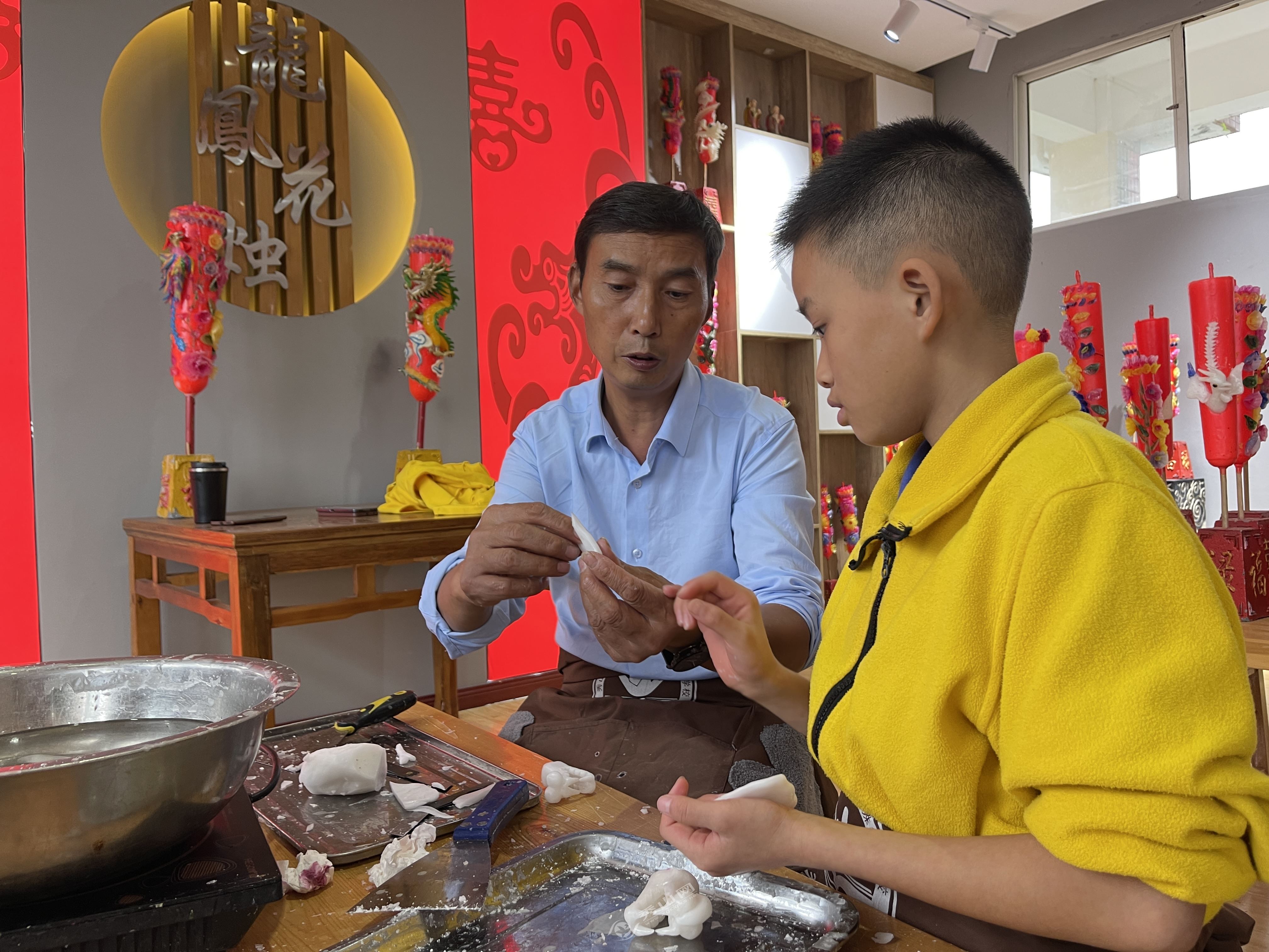 “2019年,有幸跟随陈建友老师系统学习龙凤花烛制作工艺,在陈老师的悉心教导下,如今我已基本能独立完成双喜烛、花烛、龙凤烛等的制作,我很感谢陈老师对我的关心、照顾和教导,让我有了一技之长,能够自食其力。”曹雳说。