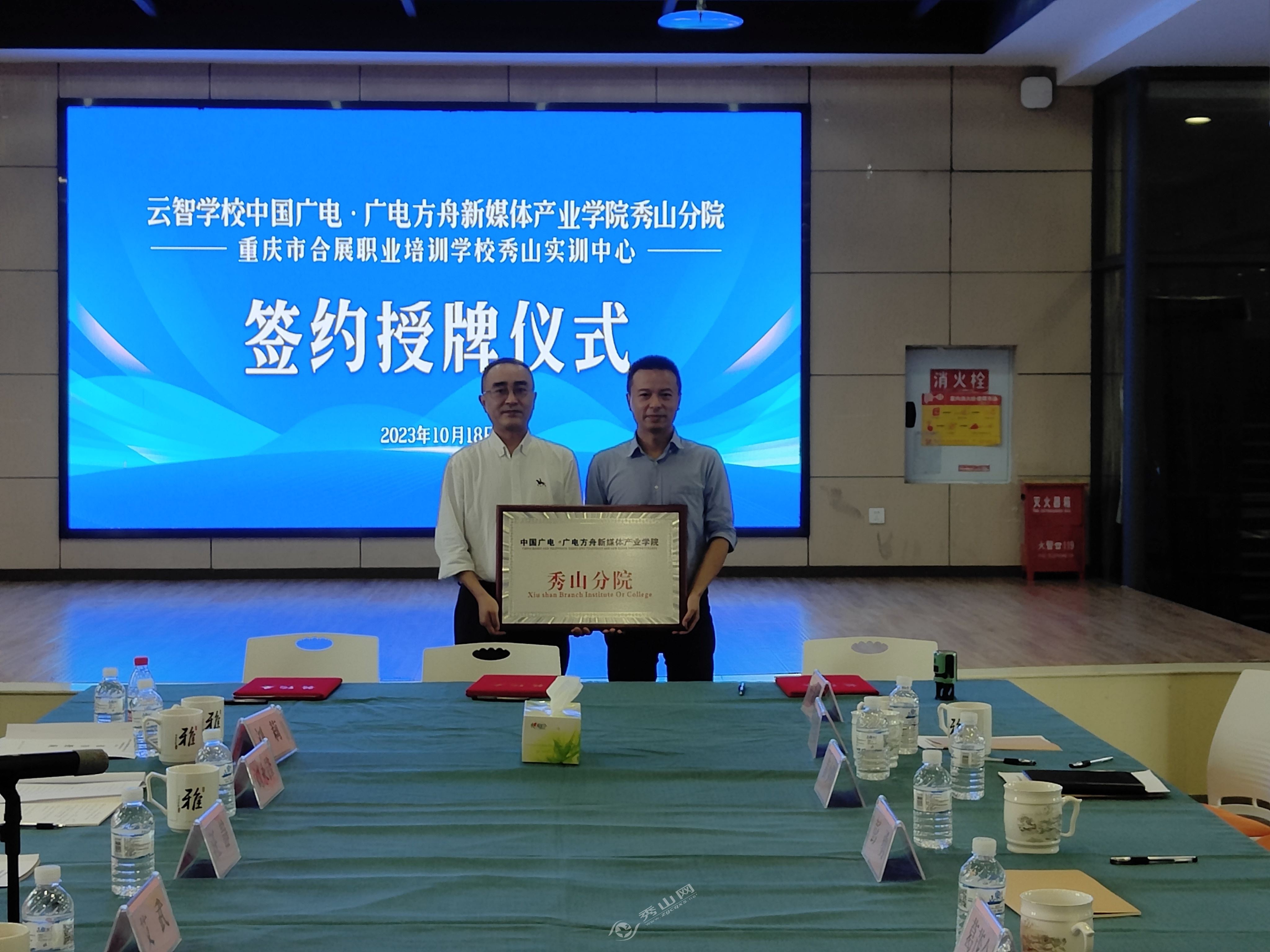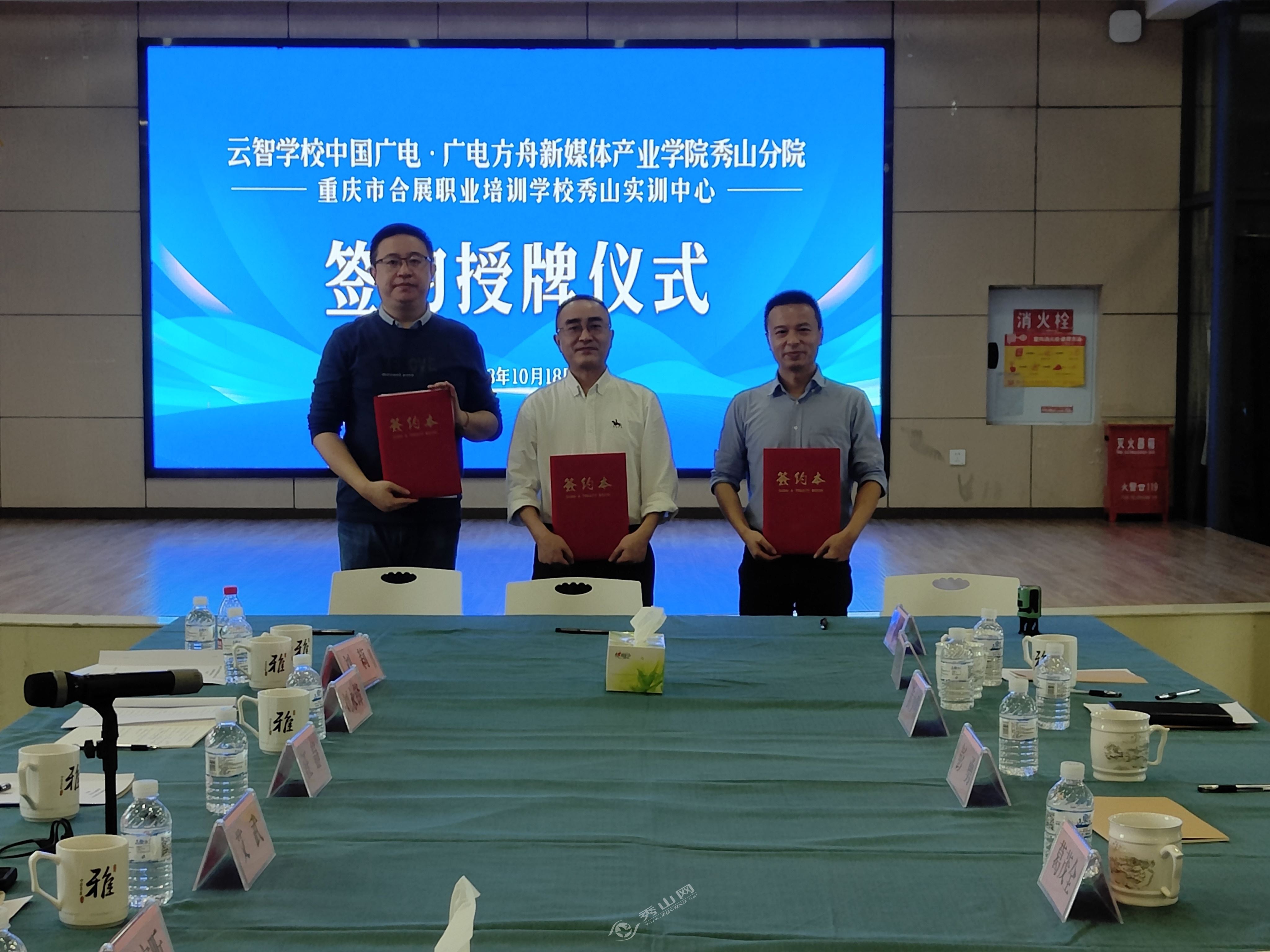 秀山网讯 为进一步推进人才培养,加强合作双方的深度交流和共同发展。10月18日上午,云智学校中国广电·广电方舟新媒体产业学院秀山分院重庆市合展职业培训学校秀山实训中心签约授牌仪式在微电影城多功能厅举行。